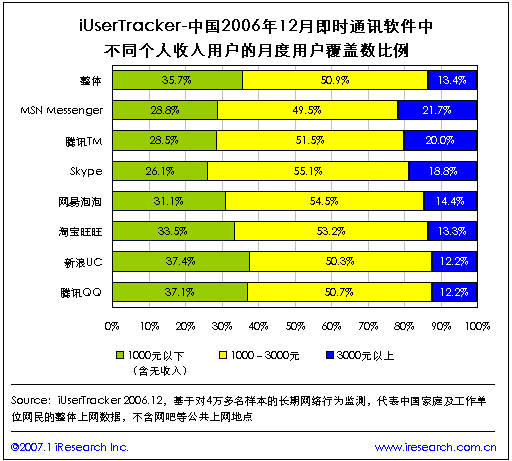 根據(jù)iResearch艾瑞市場(chǎng)咨詢(xún)最新推出的網(wǎng)民連續(xù)用戶(hù)行為研究系統(tǒng)iUserTracker的最新數(shù)據(jù)表示,2006年12月,即時(shí)通訊軟件的月度總覆蓋用戶(hù)數(shù)為10183萬(wàn)人,比2006年11月上升了0.8%,其中使用騰訊QQ的用戶(hù)最多,占94%,MSN Messenger排名第二,占35.6%,淘寶旺旺排名第三,占29%。在最近四個(gè)月內(nèi),即時(shí)通訊類(lèi)軟件的月度總覆蓋用戶(hù)數(shù)總體保持增長(zhǎng)。