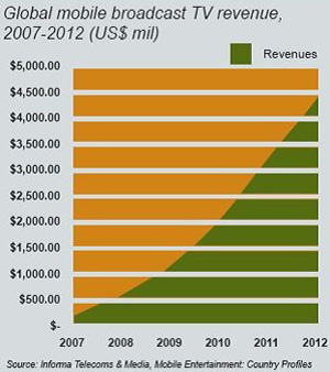根據(jù)市場研究公司Informa Telecoms &Media的調(diào)查數(shù)據(jù)顯示,移動電視市場在韓國、意大利和美國市場帶動下,將在2007年達(dá)到美金2.19億元;至2012年,移動電視市場預(yù)計能產(chǎn)生美金44億元的收益,而美國將成為最大的單一市場,占有全球20%的收益。Informa甚至認(rèn)為在2009年,美國就可超越韓國,成為移動電視最大的單一市場。