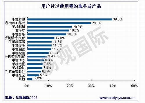 據(jù)易觀國際《中國手機(jī)應(yīng)用市場用戶調(diào)研報(bào)告2008》研究發(fā)現(xiàn),用戶付過使用費(fèi)的手機(jī)應(yīng)用服務(wù)及產(chǎn)品中,手機(jī)游戲、移動(dòng)IM和手機(jī)郵箱的比例較高。其中39.6%的手機(jī)應(yīng)用用戶付費(fèi)玩過手機(jī)游戲,29.8%的用戶曾經(jīng)為移動(dòng)IM付費(fèi),而手機(jī)郵箱的付費(fèi)用戶將達(dá)20%。其他手機(jī)應(yīng)用產(chǎn)品或服務(wù)中,付費(fèi)用戶的比例相當(dāng),均在10%左右,但是有近20%的用戶沒有用過任何的付費(fèi)服務(wù)或產(chǎn)品。