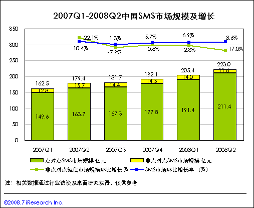 08Q3中國短信市場規(guī)模將繼續(xù)保持增長,非點(diǎn)對(duì)點(diǎn)業(yè)務(wù)下滑放緩