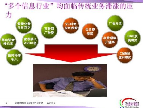 第四,廣電也有它面臨的問題,像現(xiàn)在的收視費怎么提升,收費頻道怎么讓大家接受,CMMB怎樣盈利,廣告被分流等等。