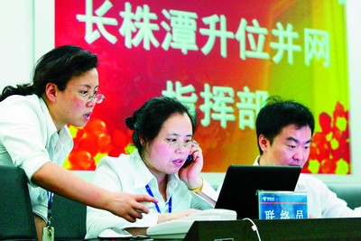 6月28日長株潭升位并網后,網內網外用戶撥打120的方式將發(fā)生較大變化。圖為中國電信長沙分公司長株潭升位并網指揮部工作人員正在緊張工作之中。