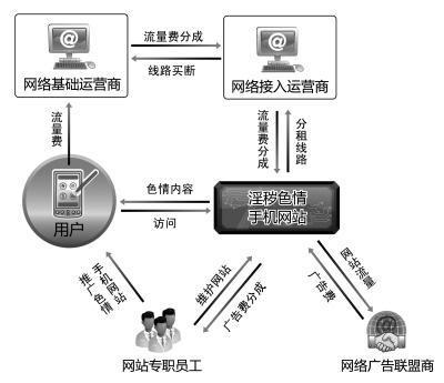 以包裝成彩鈴的標(biāo)價2塊錢的淫穢色情視頻為例,用戶下載后,電信運營商就會從上網(wǎng)的手機(jī)賬號上扣掉2元錢,之后電信運營商就會按照與增值服務(wù)商的分成協(xié)議規(guī)定,按一定比例與增值服務(wù)商進(jìn)行分成,比如按3:7進(jìn)行分成,電信運營商就會將2元錢中的0.6元留為已有,將剩余的1.2元交給增值服務(wù)商,增值服務(wù)商再將1.2元中的一部分按比例分給內(nèi)容提供商。在這個過程中,電信運營商不僅獲得了增值服務(wù)分成的錢,而且由于提供了上網(wǎng)服務(wù),還會從手機(jī)用戶那里收取下載彩鈴所需要的數(shù)據(jù)流量費。
