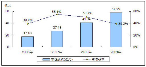 圖: 2006-2009年中國(guó)BPO市場(chǎng)規(guī)模與增長(zhǎng)