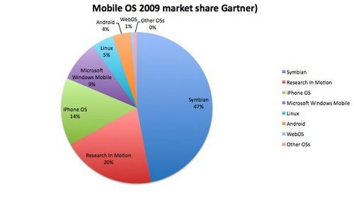 據(jù)國外媒體報(bào)道,信息技術(shù)研究和咨詢的公司Gartner數(shù)據(jù)顯示,2009年諸多智能手機(jī)操作系統(tǒng)中,蘋果iPhone的全球市場(chǎng)份額達(dá)到了14.4%,比前年提升了6.2個(gè)百分點(diǎn),幾乎翻了一番。然而,跟排在第一位的諾基亞塞班系統(tǒng)相比,iPhone在市場(chǎng)份額方面還是略遜一籌,不過,相比起來,諾基亞智能手機(jī)的市場(chǎng)份額較之前的一年卻下降了5.5個(gè)百分點(diǎn),但仍占據(jù)了幾乎半壁江山(46.9%)。RIM的黑莓系統(tǒng)在去年市場(chǎng)份額提升了3.3%,達(dá)到19.9%,僅次于塞班,位居第二。
