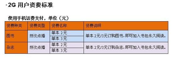 據(jù)了解,中國聯(lián)通手機閱讀業(yè)務只針對聯(lián)通網內手機用戶,采用按次點播(按本訂購)的資費標準。同時,2G用戶和3G用戶采用不同的支付方式,2G用戶使用手機話費支付,3G用戶使用M/T支付。