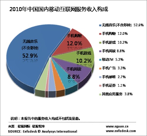 從收入構(gòu)成看來,無線音樂、手機(jī)游戲、手機(jī)閱讀逐漸成為三大主要移動(dòng)互聯(lián)網(wǎng)娛樂應(yīng)用,手機(jī)購物增速明顯。