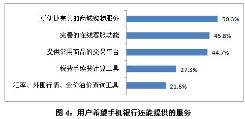 根據(jù)用戶調(diào)研數(shù)據(jù)分析,超過四成的手機(jī)銀行用戶能夠接受對(duì)金融產(chǎn)品如手機(jī)炒股和手機(jī)支付實(shí)行收費(fèi),同時(shí),有約兩成的用戶能夠接受對(duì)手機(jī)游戲和手機(jī)地圖導(dǎo)航實(shí)行收費(fèi)。這表明,對(duì)特定的手機(jī)應(yīng)用服務(wù)收費(fèi)能夠得到部分用戶的接受和認(rèn)可。