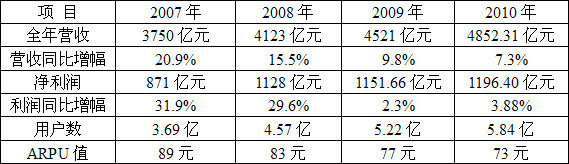 上周,中國移動公布了2010年全年業(yè)績,全年實(shí)現(xiàn)收入4852.31億元,比2009年增長7.3%;股東應(yīng)占利潤為1196.40億元,比2009年增長3.9%。