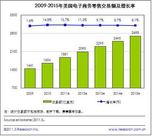 iResearch艾瑞咨詢根據(jù)美國商務部公布的數(shù)據(jù)發(fā)現(xiàn),2010年美國電子商務零售市場實現(xiàn)金融危機以來的首次強勁復蘇,其銷售額達1654億美元,較2009年同比增長14.8%。同時,根據(jù)eMarketer的美國電子商務零售預測模型獲得的數(shù)據(jù)顯示,2011年美國電子商務零售交易額將達到1881億美元。隨著電子商務的不斷成熟,一直到2015年期間美國電子商務零售交易額將保持穩(wěn)定健康的增長,且增長率趨于持續(xù)小幅降低。