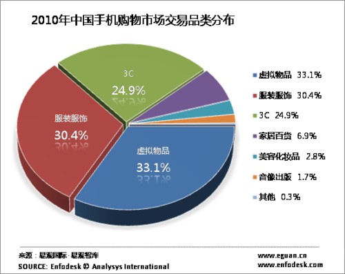 數(shù)據(jù)顯示2010年虛擬交易規(guī)模占比仍然居于交易品類的首位。虛擬交易包括手機充值、網(wǎng)游充值、網(wǎng)購彩票以及機票等業(yè)務(wù)。手機購物的發(fā)展周期特征呈現(xiàn)于PC端電子商務(wù)類似特征,不同的是手機端消費與服務(wù)的便捷性強相關(guān)。易觀研究認(rèn)為,高標(biāo)準(zhǔn)化、便捷性消費是首先爆發(fā)的類目,如手機充值、彩票。未來此類交易仍然會是手機購物的主流。