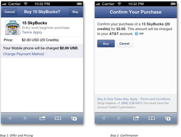 現(xiàn)在,針對應用內支付,F(xiàn)acebook聯(lián)合移動運營商推出了便捷的支付服務,允許用戶在購買Facebook應用開發(fā)商所提供的服務、游戲或者升級服務時,直接將交易費記到電話賬單當中。整個流程被簡化成2步:首先用戶選擇需要購買的服務,然后打開支付窗口,點擊確認即可。