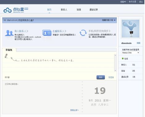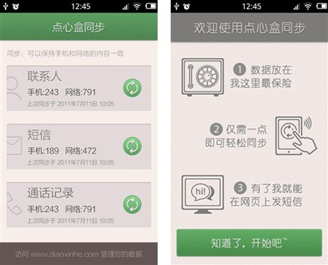 點(diǎn)心盒同步使用十分方便,在手機(jī)上安裝客戶端,通過注冊(cè)獲取賬號(hào),登陸后進(jìn)入軟件的主界面,僅需輕點(diǎn)同步按鈕,即可將聯(lián)系人、短信和通話記錄同步到點(diǎn)心盒網(wǎng)站上。此時(shí),不僅在手機(jī)端,用戶在云端通過點(diǎn)心盒網(wǎng)站也可以進(jìn)行聯(lián)系人新建、編輯和刪除的操作,并支持聯(lián)系人導(dǎo)入和去除重復(fù)的聯(lián)系人,方便聯(lián)系人管理。
