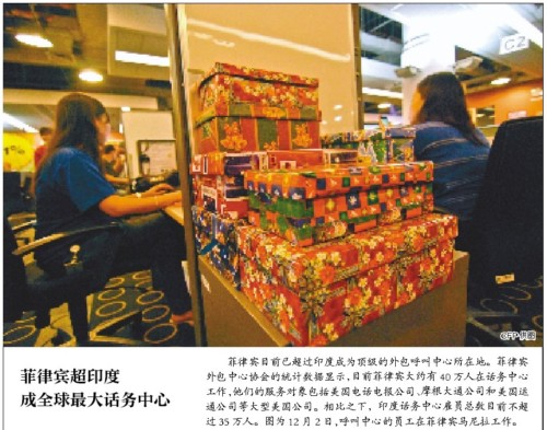 菲律賓目前已超過印度成為頂級(jí)的外包呼叫中心所在地。菲律賓外包中心協(xié)會(huì)的統(tǒng)計(jì)數(shù)據(jù)顯示,目前菲律賓大約有40萬(wàn)人在話務(wù)中心工作,他們的服務(wù)對(duì)象包括美國(guó)電話電報(bào)公司、摩根大通公司和美國(guó)運(yùn)通公司等大型美國(guó)公司。相比之下,印度話務(wù)中心雇員總數(shù)目前不超過35萬(wàn)人。