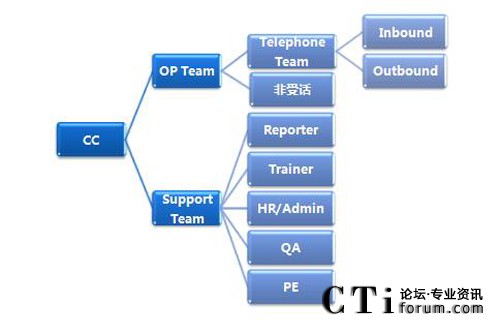 呼叫中心的組織結(jié)構(gòu)和人員構(gòu)成,按照橫向切面來(lái)看,分別存在有:一線、二線(值班長(zhǎng))、TL、SV、OM等職位,按照縱向切面來(lái)看,分別存在有:運(yùn)營(yíng)團(tuán)隊(duì)和支撐團(tuán)隊(duì),運(yùn)營(yíng)團(tuán)隊(duì)包括有:受話團(tuán)隊(duì)(Inbound和Outbound)、非受話團(tuán)隊(duì),支撐團(tuán)隊(duì)包括有:報(bào)表專(zhuān)員、培訓(xùn)專(zhuān)員、人事行政專(zhuān)員、質(zhì)控專(zhuān)員、流程工程師等崗位。圖形展示為: