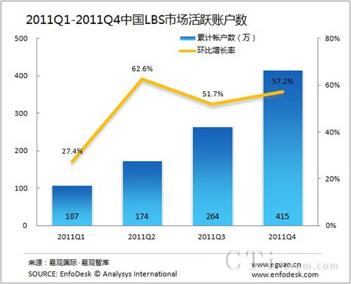 截止2011年12月底,中國移動(dòng)位置交友應(yīng)用(LBS)市場(chǎng)活躍賬戶規(guī)模達(dá)到415萬,環(huán)比增長(zhǎng)率提升至57.2%。