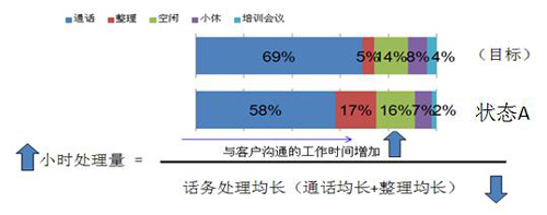 通話狀態(tài)是CSR的重要生產(chǎn)時(shí)間。筆者同過很多CSR交談,發(fā)現(xiàn)他們都有此看法,通話均長適當(dāng)增長通話狀態(tài)就會(huì)提高。但我認(rèn)為這是一個(gè)吃力不討好的方法,影響了個(gè)人的效能與績效收入。對(duì)于CSR個(gè)體,更重要的是提升自己的應(yīng)答能力,適當(dāng)降低自我的通話均長與整理均長。只要做好小休狀態(tài)(CSR主要責(zé)任)、空閑狀態(tài)(排班師、現(xiàn)場主管主要責(zé)任)、整理狀態(tài)(CSR、小組主要責(zé)任),通話狀態(tài)就會(huì)自然增加。
