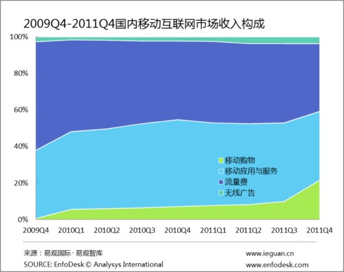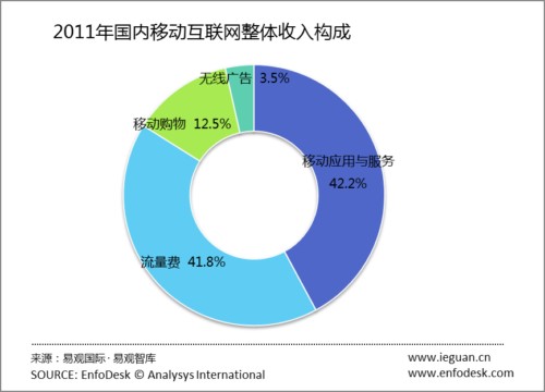 從市場規(guī)模來看,2011年出現(xiàn)較大的拐點(diǎn),流量費(fèi)占比已經(jīng)低于整體移動互聯(lián)網(wǎng)市場規(guī)模占比的50%以下,整體市場的貢獻(xiàn)主要來自于流量費(fèi)及移動應(yīng)用與服務(wù),其中應(yīng)用及服務(wù)占整體移動互聯(lián)網(wǎng)市場規(guī)模的42.9%,而移動應(yīng)用與服務(wù)中,無線音樂、手機(jī)游戲及手機(jī)閱讀依然是主要推動力,尤其是手機(jī)游戲和手機(jī)閱讀市場,仍有很大的成長空間。
