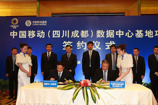 2012年2月22日,中國移動(四川成都)數(shù)據中心基地項目在四川成都正式簽約啟動。成都市政府葛紅林市長、劉超常委、白剛副市長與中國移動通信集團公司魯向東副總裁、中國移動四川公司簡勤總經理等出席簽約儀式,成都市政府與中國移動四川公司代表雙方簽署合作協(xié)議。