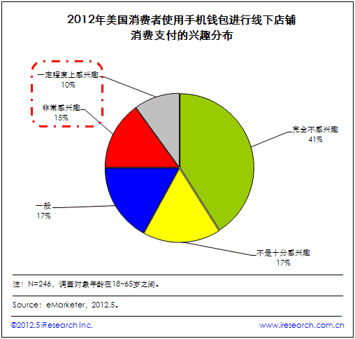 iResearch艾瑞咨詢整理eMarketer調查數(shù)據(jù)發(fā)現(xiàn),盡管手機支付市場增速迅猛,但其在美國消費者中的接受程度相對較低。數(shù)據(jù)顯示,被調查者中只有1/4的美國用戶對使用手機錢包在線下店鋪消費感興趣,而相比之下,58%的消費者對手機錢包技術不感興趣,其中包括41%的人完全沒興趣。
