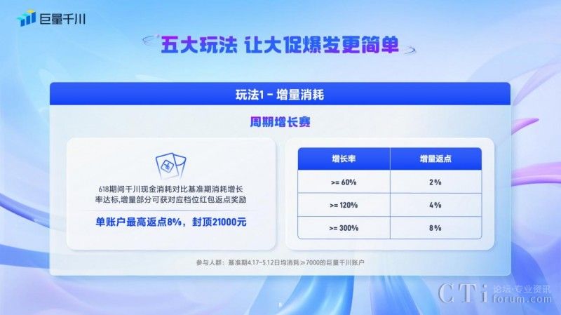 一、「周期增長賽」:針對在618好物節(jié)期間現(xiàn)金消耗對比基準期消耗增長率達標的商家,增量部分可獲得對應檔位紅包返點獎勵,單賬戶最高返點8%,封頂21000元。