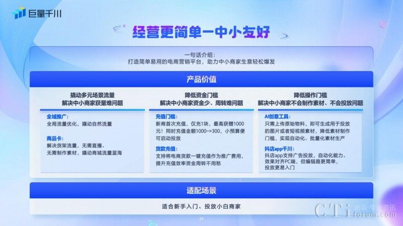 針對中小商家經(jīng)營長效問題,巨量千川打造簡單易用的電商營銷平臺。撬動多元場景流量,解決中小商家獲量難題;降低資金門檻,解決資金少、周轉(zhuǎn)難的問題;降低素材制作操作門檻,解決商家“不會投”、“不敢投”的難題,讓經(jīng)營更簡單。