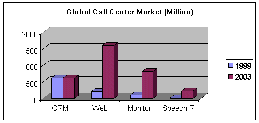 。。在1999年,全球呼叫中心應用軟件的市場總值為29億美元,到2003年這一數(shù)字將增長近三倍,達到85億美元。這一增長主要來源于對基于互聯(lián)網(wǎng)呼叫應用軟件以及呼叫監(jiān)控解決方案的需求。Data-monitor 市場分析專家在1999年針對呼叫中心軟件市場進行調(diào)研,具體數(shù)字詳見下表: