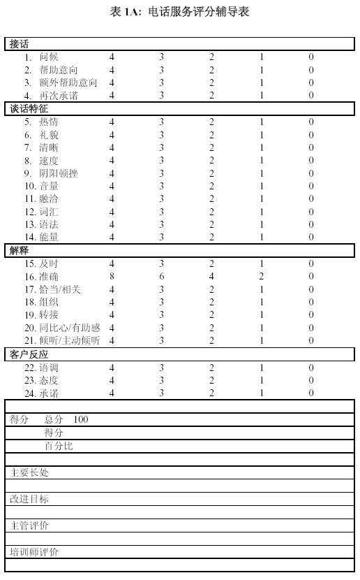 。。無論是客戶服務(wù)還是電話銷售, 輔導(dǎo)表所測(cè)定的內(nèi)容一定要和培訓(xùn)內(nèi)容一致起來. 沒有培訓(xùn)過的項(xiàng)目, 不要要求座席代表自行理解.