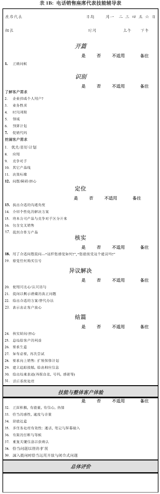 。。以上的表格主要是給從事客戶服務(wù)的座席代表使用,以下的表格是根據(jù)我自己使用過的對(duì)具電話營銷功能的座席代表輔導(dǎo)表改動(dòng)而來。