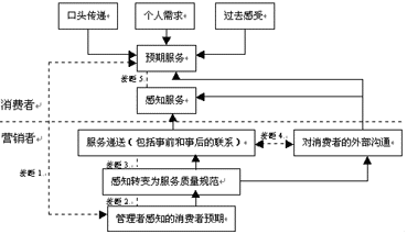 柏拉·所羅門、塞登爾和貝利給出了一種服務(wù)質(zhì)量模式,其重要一點(diǎn)是對(duì)服務(wù)提供者提供預(yù)期服務(wù)質(zhì)量的主要要求。下圖表明招致服務(wù)失敗的5個(gè)差距: