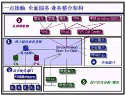 在“一對一模式”中,BroadVision公司可以為原有后臺系統(tǒng)提供有機的整合(如連接用戶的記費、業(yè)務(wù)、用戶數(shù)據(jù)系統(tǒng)),使其在前臺可提供多種用戶的接入手段,形成業(yè)務(wù)的完整流程,如通過多種接入手段提供查詢、咨詢、受理、投訴等業(yè)務(wù);電信企業(yè)還可通過此平臺提供增值業(yè)務(wù),如電子商務(wù)、信息服務(wù)、代繳費等。