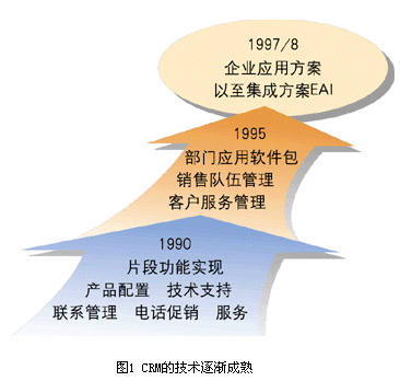 ----二是CRM的技術逐漸走向成熟(見圖1)。1990年左右,CRM方案只是片斷功能的實現(xiàn),到1995年以來、1997/8年以來,逐漸出現(xiàn)了部門級應用軟件包、企業(yè)級應用方案。有些企業(yè)甚至已經(jīng)開始關心自己原有的ERP系統(tǒng)與正在建設的CRM系統(tǒng)之間的集成問題。