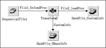 客戶信息數(shù)據(jù)庫中的各表以客戶編碼為關鍵字進行關聯(lián),客戶編碼是由客戶的證件號碼經(jīng)過專門的算法計算產(chǎn)生的唯一客戶標識。根據(jù)各個系統(tǒng)中客戶數(shù)據(jù)與新系統(tǒng)客戶信息的對照關系我們設計數(shù)據(jù)抽取轉(zhuǎn)換的程序,如圖4所示是一個DataStage的Job。