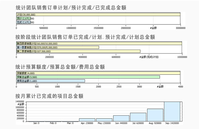 在VamCRM項(xiàng)目組合管理中集成項(xiàng)目數(shù)據(jù)的統(tǒng)計(jì)與分析,可以直接監(jiān)控項(xiàng)目計(jì)劃、預(yù)計(jì)及完成的項(xiàng)目數(shù)量、總金額和費(fèi)用的統(tǒng)計(jì),也可按月累計(jì)已完成的項(xiàng)目數(shù)量、總金額和費(fèi)用,直接衡量項(xiàng)目實(shí)施的結(jié)果與效益。在費(fèi)用管理模塊中集成費(fèi)用數(shù)據(jù)的統(tǒng)計(jì)與分析,對(duì)于所有費(fèi)用可以按人及費(fèi)用類型進(jìn)行統(tǒng)計(jì),實(shí)時(shí)知道哪一個(gè)人或哪一類費(fèi)用開(kāi)銷最多,以及費(fèi)用與預(yù)算的對(duì)比分析。