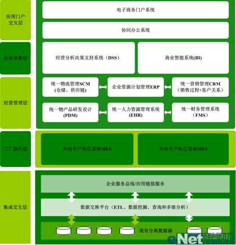 根據(jù)企業(yè)管理發(fā)展戰(zhàn)略及目標,需要考慮建設“集成化數(shù)字管控制造系統(tǒng)”,涵蓋企業(yè)決策層、企業(yè)經(jīng)營管理層。根據(jù)整體業(yè)務模式,企業(yè)經(jīng)營管理層又可以進一步分解為公司管理層和工廠執(zhí)行層;從信息化戰(zhàn)略支撐角度可以分解為企業(yè)門戶交互層、應用系統(tǒng)層、應用集成層和網(wǎng)絡支撐層。實現(xiàn)企業(yè)信息流、資金流、物流、商物流的高度集成、統(tǒng)一,為企業(yè)生產、經(jīng)營提供強有力的信息化支撐。