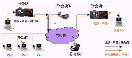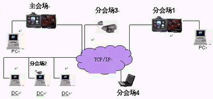 可視化Ip電話會議系統(tǒng): 是利用計算機,多媒體通信技術(shù)和設(shè)備,通過傳輸信道在兩地或多個地點之間開會的一種通信手段。在召開會議時,處于兩地或不同地點的與會代表,既可以聽到對方的聲音,又可以看到對方的形象,同時還能看到對方會議室的場景,以及在會議中展示的事物、圖片、表格、文件等,縮短了與會代表的距離,使大家好像在同一會議室參加會議一樣。它的廣泛應用必然產(chǎn)生巨大的社會效益和經(jīng)濟效益。系統(tǒng)結(jié)構(gòu)簡圖如下: