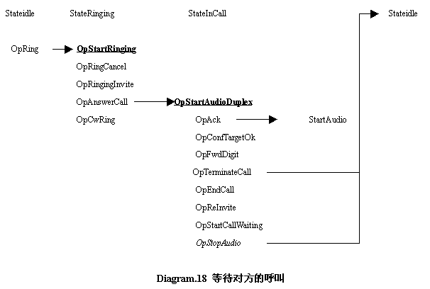當用戶進入Idle狀態(tài)以后,如果系統(tǒng)接收到一個INVITE消息,系統(tǒng)將進入Ring狀態(tài),并且進入Opring操作中,這個時候硬件設(shè)備將播放振鈴聲,這個時候如果用戶決定摘機通話,那么offhook事件就會產(chǎn)生,同時OpAnswerCall將使狀態(tài)機進入InCall狀態(tài),向主叫發(fā)送200響應(yīng)消息,同樣RTP/RTCP通道打開,開始通話,如果通話完畢,雙方掛機,那么互相發(fā)送SIP