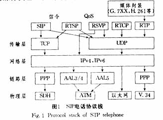 SIP不是垂直型通信系統(tǒng),不能獨立提供業(yè)務,它必須與其它協(xié)議共同使用來構(gòu)建一個完整的多媒體體系結(jié)構(gòu),所以在構(gòu)建下一代網(wǎng)絡的多媒體體系時,采用以下的協(xié)議組合提供多媒體業(yè)務;赟IP的電話協(xié)議棧如圖1所示。圖1中,①網(wǎng)絡層:使用IPv4或IPv6(建議IPv6);②傳輸層:使用TCP或UDP(建議UDP);③應用層:包括以SIP為核心的多個協(xié)議。