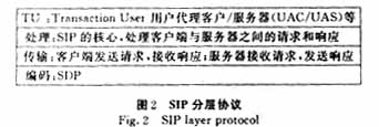 SIP本身是一種分層協(xié)議,如圖2所示。由此可見,SIP采用C/S結(jié)構(gòu),通過MESSAGE機制來建立會話。因為SIP處理的是客戶端與服務器之間的請求和響應,所以SIP消息包括了請求消息和響應消息。二者都具有相同的消息格式: