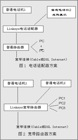 利用電話適配器和寬帶路由器實現(xiàn)VoIP服務提供以及與PC的連接,分別如圖1和圖2所示。