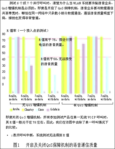 上述操作是為了啟動(dòng)QoS保障機(jī)制后,系統(tǒng)就能取得顯著的成效。但只有Aruba的系統(tǒng)在所有測(cè)試中保持了一貫的良好表現(xiàn),在具有QoS保障機(jī)制的情況下,甚至在最惡劣的情況下(7個(gè)并行VoIP呼叫并加入數(shù)據(jù)流業(yè)務(wù)),它仍然能夠傳送出和付費(fèi)電話通話質(zhì)量一樣的信號(hào)。Aruba的系統(tǒng)在打開(kāi)QoS增強(qiáng)機(jī)制的情況下,系統(tǒng)承載業(yè)務(wù)最空閑和最繁忙的測(cè)試結(jié)果差別很小。