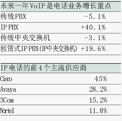 事實(shí)上,北美市場(chǎng)的實(shí)際銷售量已經(jīng)表明,市場(chǎng)中的傳統(tǒng)語(yǔ)音交換機(jī)銷售量已經(jīng)在明顯下降,而具備IP功能或純IP系統(tǒng)的銷售量卻在穩(wěn)步上升。Gartner 預(yù)計(jì),2005年在北美地區(qū)銷售的純IP系統(tǒng)總價(jià)值將高達(dá)9.03億美元,比2004年的6.86億美元上升32%。同時(shí),傳統(tǒng)電路交換系統(tǒng)的銷售量將從2004年的14億美元下降至9.99億美元,下降的幅度是32%。而混合式系統(tǒng)的銷量增長(zhǎng)幅度可望達(dá)到30%,也就是說(shuō),從2004年的1.5億美元增長(zhǎng)到2005年的2億美元。