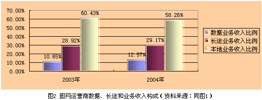 目前數(shù)據(jù)業(yè)務(wù)收入與話音業(yè)務(wù)收入相差懸殊,通過發(fā)展數(shù)據(jù)業(yè)務(wù)彌補(bǔ)VoIP造成的話音收入損失尚需時(shí)日。以固網(wǎng)運(yùn)營(yíng)商為例,2003年和2004年數(shù)據(jù)業(yè)務(wù)、長(zhǎng)途業(yè)務(wù)和本地業(yè)務(wù)收入構(gòu)成見圖2所示。