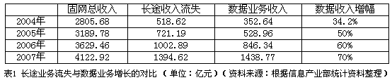 表1 長(zhǎng)途業(yè)務(wù)流失與數(shù)據(jù)業(yè)務(wù)增長(zhǎng)的對(duì)比 (單位:億元)(資料來源:根據(jù)信息產(chǎn)業(yè)部統(tǒng)計(jì)資料整理)