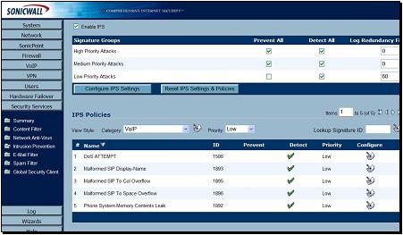 SonicWALL入侵檢測(cè)服務(wù)(IPS)能夠?yàn)閂oIP協(xié)議應(yīng)用層提供全面保護(hù)。IPS集成了一個(gè)可配置的超高性能掃描引擎,配合動(dòng)態(tài)更新和擁有1900多攻擊和漏洞簽名的數(shù)據(jù)庫(kù),可以保護(hù)網(wǎng)絡(luò)免受最復(fù)雜的木馬和變形威脅的影響。SonicWALL已經(jīng)利用一系列VoIP相關(guān)的簽名來(lái)擴(kuò)展其IPS簽名數(shù)據(jù)包,可以防止惡意業(yè)務(wù)流到達(dá)受保護(hù)的VoIP電話和服務(wù)器。
