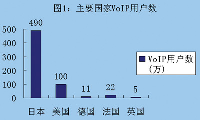 目前全球VoIP市場(chǎng)已經(jīng)形成,明顯的市場(chǎng)劃分也已出現(xiàn)。截至2004年底,日本共擁有VoIP用戶490萬(wàn),美國(guó)100萬(wàn),德國(guó)11萬(wàn),法國(guó)22萬(wàn),英國(guó)5萬(wàn) (如圖1所示)。根據(jù)Insight Research的調(diào)查,全球VoIP市場(chǎng)收入將在2005年達(dá)到820億美元,在2007年達(dá)到1965億美元,其中大部分增長(zhǎng)是由商業(yè)用戶驅(qū)動(dòng)的。