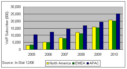 應(yīng)該說在2006年,VoIP技術(shù)已經(jīng)不是阻礙其市場(chǎng)發(fā)展的主要因素,因?yàn)镮n-Stat在全球個(gè)人VoIP消費(fèi)市場(chǎng)中作的調(diào)查顯示,約9%的VoIP用戶甚至不清楚自己在使用IP傳輸;有64%的用戶在使用免費(fèi)的VoIP服務(wù)。其次有超過73%的用戶并不把是否使用IP技術(shù)當(dāng)成選擇該業(yè)務(wù)的影響因素。而寬帶接入市場(chǎng)的競(jìng)爭(zhēng)則構(gòu)成了VoIP發(fā)展的關(guān)鍵因素,作為一種寬帶應(yīng)用,誰的接入資源占據(jù)了用戶家庭,誰就可以決定是否采用VoIP技術(shù)來提供語(yǔ)音業(yè)務(wù)。在歐洲法國(guó)Free Telecom與意大利的FastWeb都是三重播放業(yè)務(wù)的積極推進(jìn)者,在VoIP市場(chǎng)居領(lǐng)先地位;在日本Yahoo!BB擁有亞洲地區(qū)50%的寬帶VoIP用戶。幾乎所有這些寬帶ISP提供商往往采用包月的形式或者以極低的費(fèi)用提供無限制的本地或國(guó)內(nèi)通話,在國(guó)際長(zhǎng)途電話上提供極大的折扣。