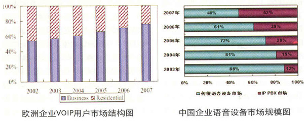相關(guān)數(shù)據(jù)顯示,企業(yè)級VOIP的市場規(guī)模將以超過40%的年復(fù)合增長率增長,2010年前仍將占據(jù)整個VOIP市場的50%以上。從“歐洲VOIP用戶市場結(jié)構(gòu)圖”來看,企業(yè)VOIP用戶的占比在逐年提升,2007年可達(dá)到70%左右。全球企業(yè)VOIP的設(shè)備銷售形勢也是一片大好,Juniper