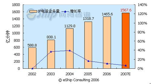 從圖中可以看出,國內(nèi)IP電話市場近年呈現(xiàn)出快速增長趨勢,2002-2007年年均增長率為20.7%。預(yù)計2007年IP電話的通話時長將達到1567.6億分鐘,同比增長7%。但從2005年開始,IP電話的增長率呈下降趨勢,這主要是受管制限制和移動長途的替代作用所致。