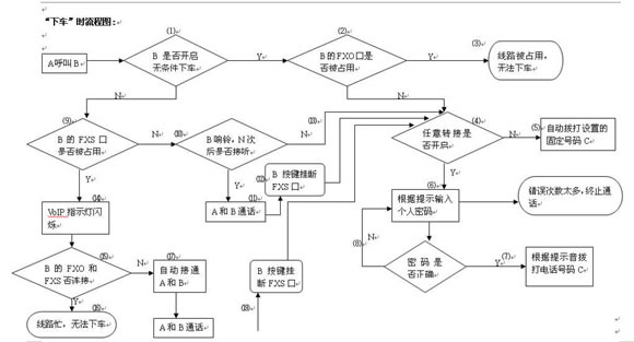 - 若A是為了下車(chē),則B端接聽(tīng)方按鍵“*#*”切斷FXS通路,然后進(jìn)入⑷--⑻。
